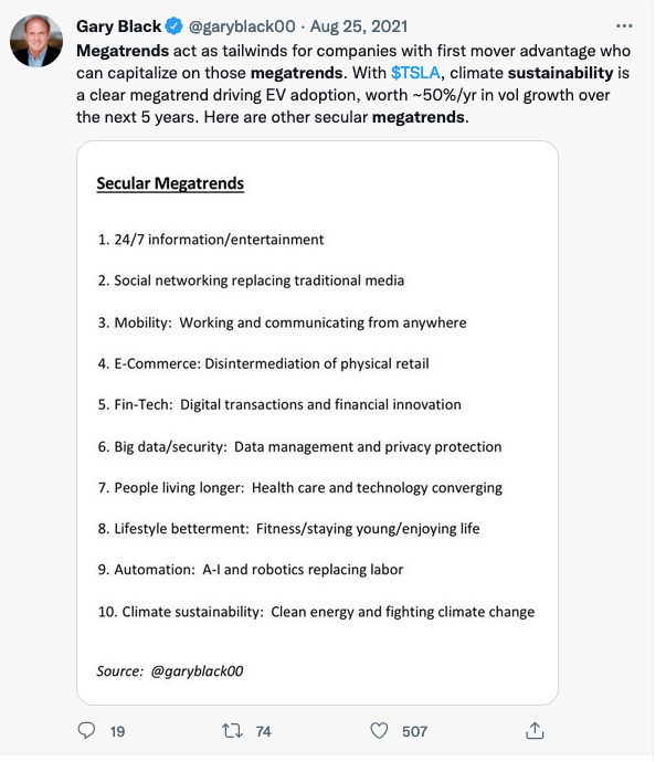 Tesla is just one example where new technologies are accelerating sustainability to solve the challenges of megatrends like clean energy by completely revolutionizing an industry.