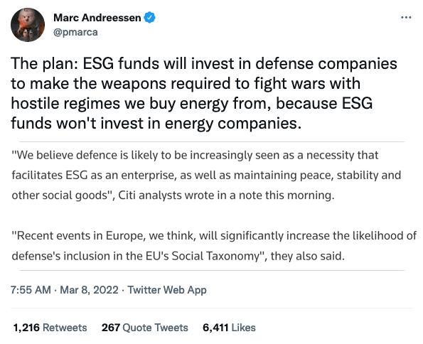 Following the war in Ukraine, Citi’s analysts are proposing ESG funds to invest in defense companies (a.k.a. weapons producers).