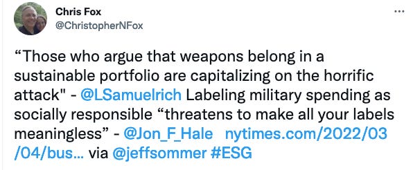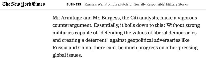 From their point of view: “Defending the values of liberal democracies and creating a deterrent, which preserves peace and global stability, is so important that weapons makers should be included in funds that carry an E.S.G., or environmental, social and governance”.