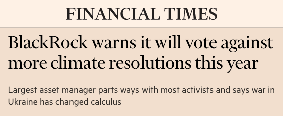 BlackRock warns that it will vote against more climate resolutions this year. The world’s largest money manager, with nearly $10 trillion assets under management, said that Russia’s invasion of Ukraine had changed the scenario, requiring more short-term investment in traditional fuel production to boost energy security.